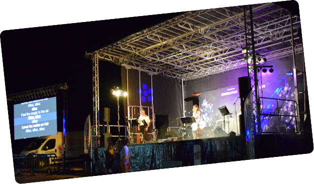 L’équipe est autonome en matériel éclairage, sonorisation, informatique, avec écran à led intérieur/extérieur de 3m50 sur 2m, ainsi qu'un plus petit écran à disposition pour le ou les participants.
